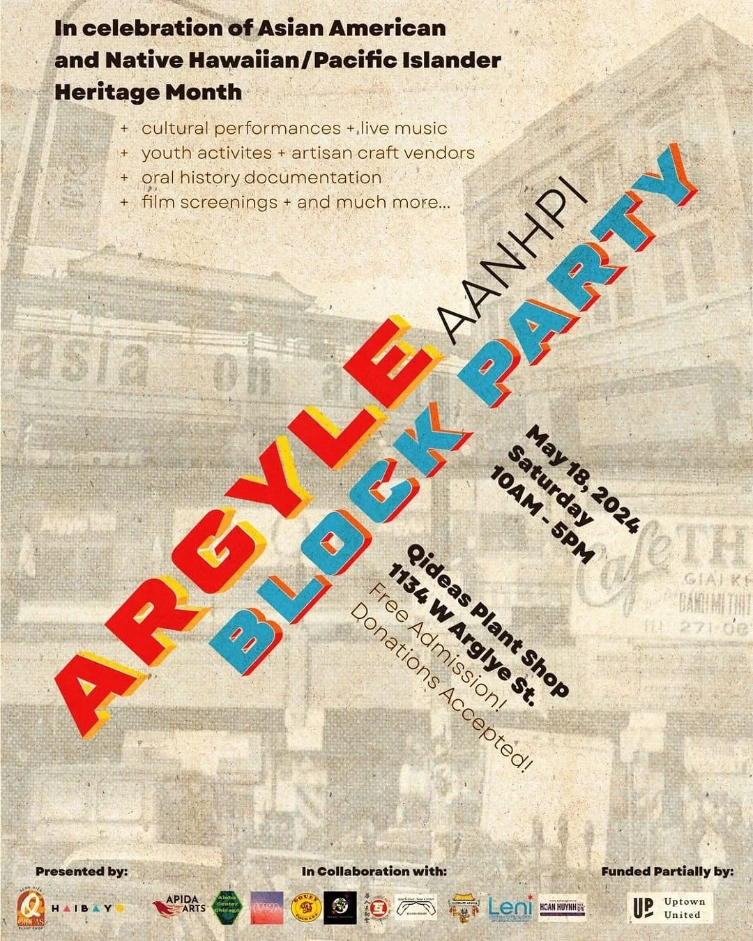 In celebration of Asian American and Native Hawaiian/Pacific Islander Heritage Month, enjoy cultural performances, live music, youth activities, artisan craft vendors, oral history documentation, film screenings, and more at the Argyle Block Party! Learn more online.